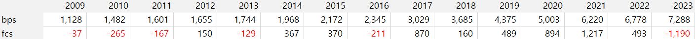 낮은 부채비율, 그러니까 돈을 거의 빌리지 않으면서도 높은 유동비율을 보여주는 것으로 봐서 벌어서 남기는 게 많은 사업을 한다는 걸 짐작할 수 있습니다. 한편, 오른편 그림의 붉은 선인 주당자유현금흐름 추이가 보이지 않는 해가 많은 것은 로그축에 그린 그래프여서 마이너스 값은 표시가 되지 않았기 때문인데, 구체적인 수치는 아래와 같습니다.