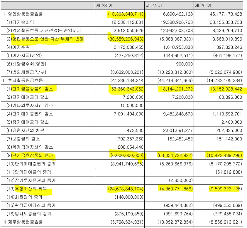 아래에 보이는 현금흐름표를 자세히 보면 작년에 큰 액수의 마이너스 현금흐름이 생긴 원인을 알 수 있습니다.