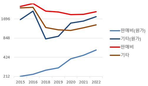 사업보고서의 '비용의 성격별 분류'에서 판관비로 분류된 항목들의 추이를 아래와 같이 그려봤습니다.
